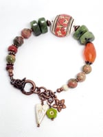 Featuring a ceramic Golem bead and a large carnelian bead, with a plethora of coordinating beads dancing around the Golem. Copper clasp, findings, and matching sweet charms. This is one of a kind. This bracelet is approximately 8”, and I can adjust the size if needed.