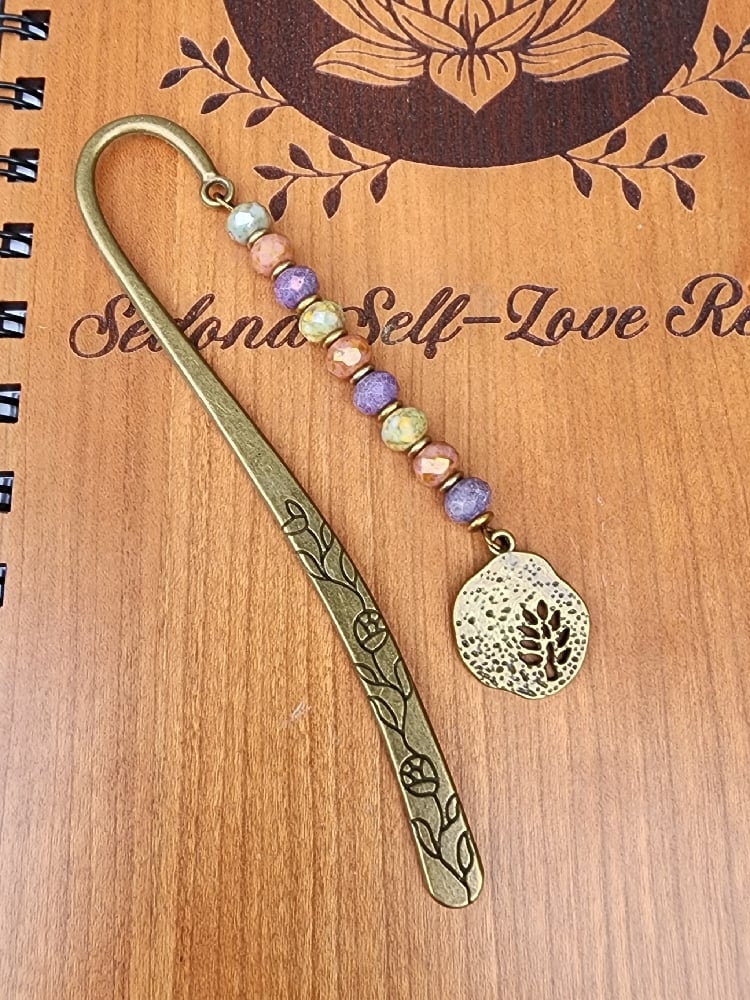 Bronze bookmark featuring beautiful Czech beads and a leaf charm.