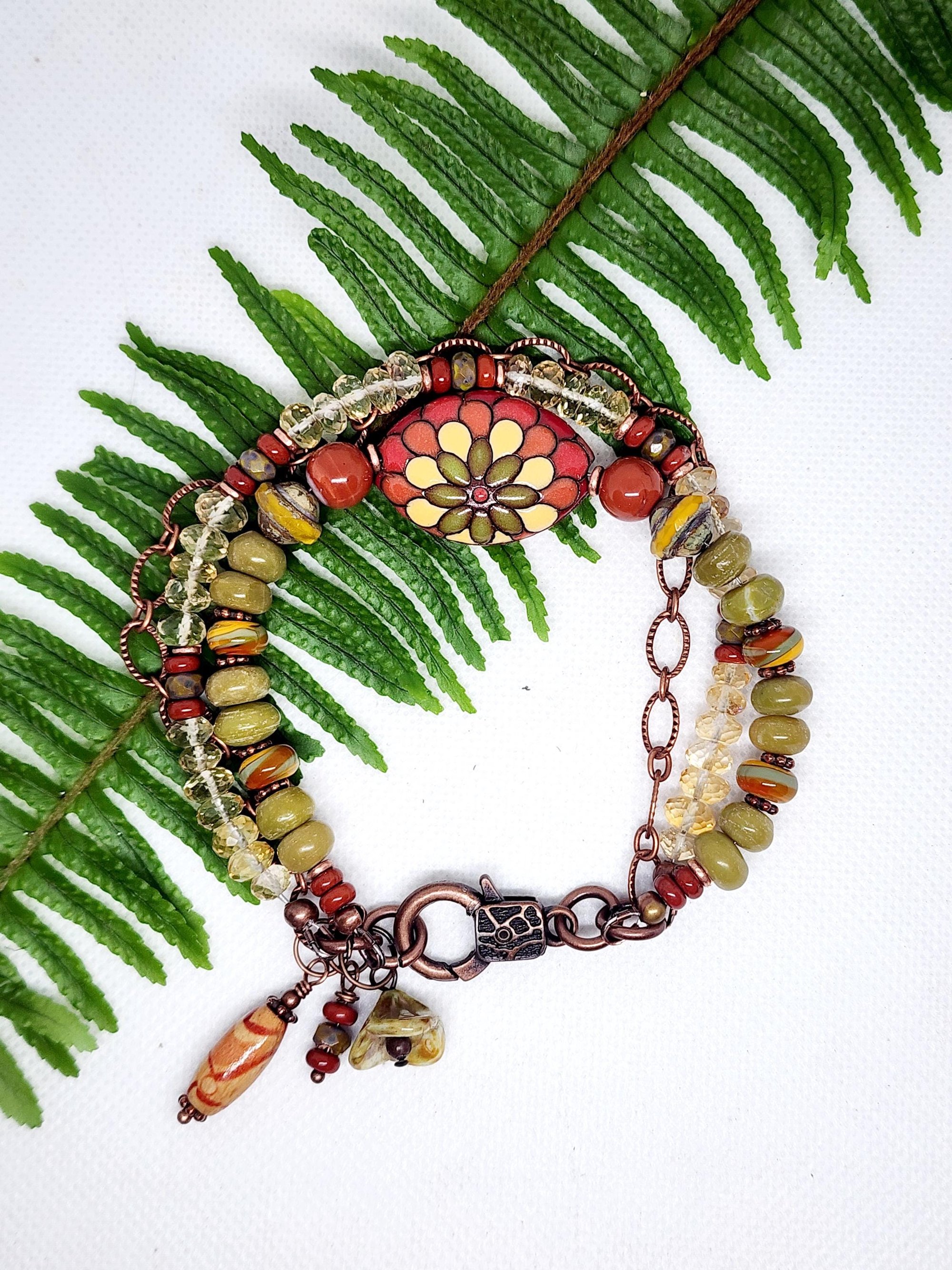 Featuring a Golem ceramic floral focal bead, lampwork beads in various fall colors, a copper chain, charms, and a copper clasp. One of a kind. This bracelet is approximately 7”, and I can adjust the size if needed.