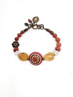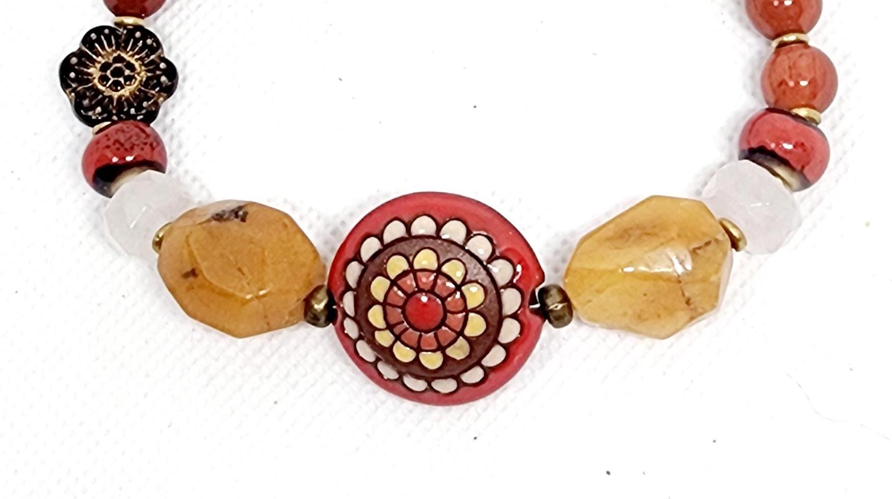 A collection of fall colors dancing around a ceramic Golem bead, jasper, moonstone, wood, Czech, and brass findings, and a clasp. One of a kind.