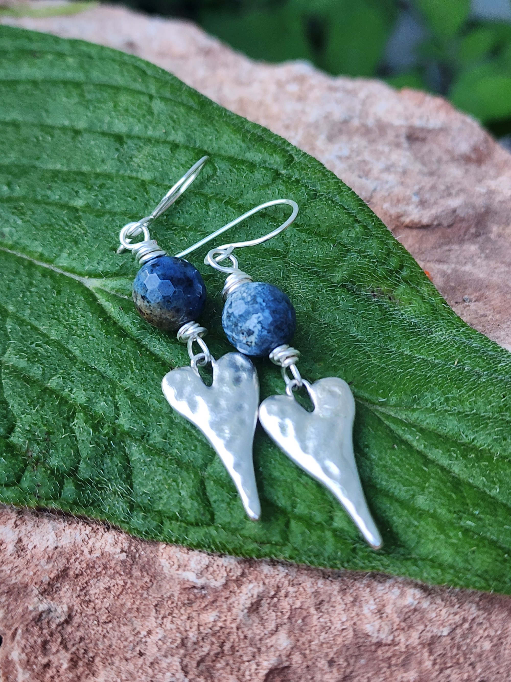 Long silver artisan hearts enhanced with beautiful blue beads hanging from handmade earwires. Approximately 2.25" long