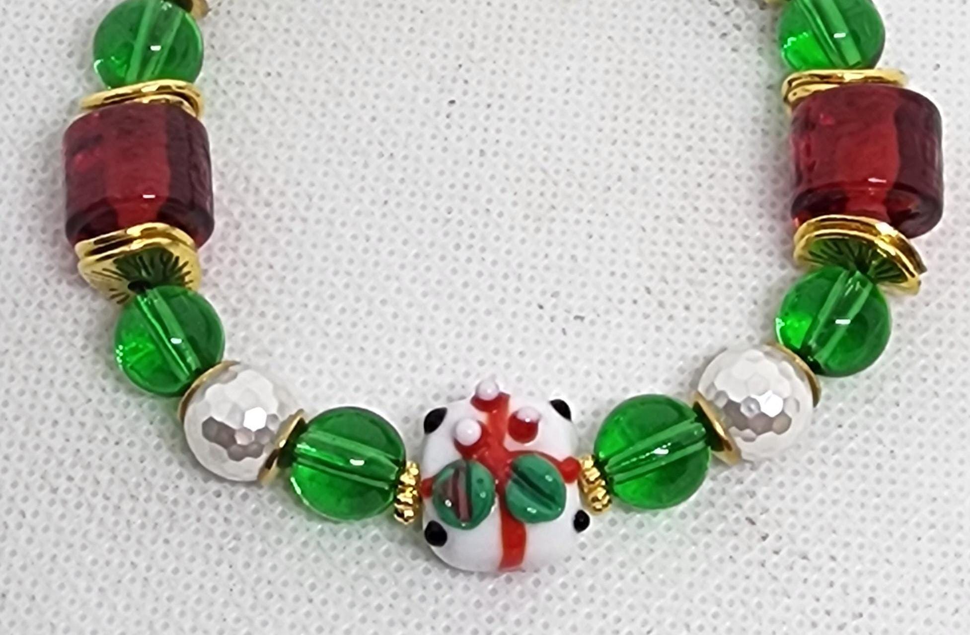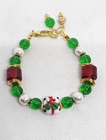 Adorable Murano glass from Italy gift bead, red and green lampwork beads, faceted pearls and sweet charms to wrap up this little holiday bracelet. One of a kind.