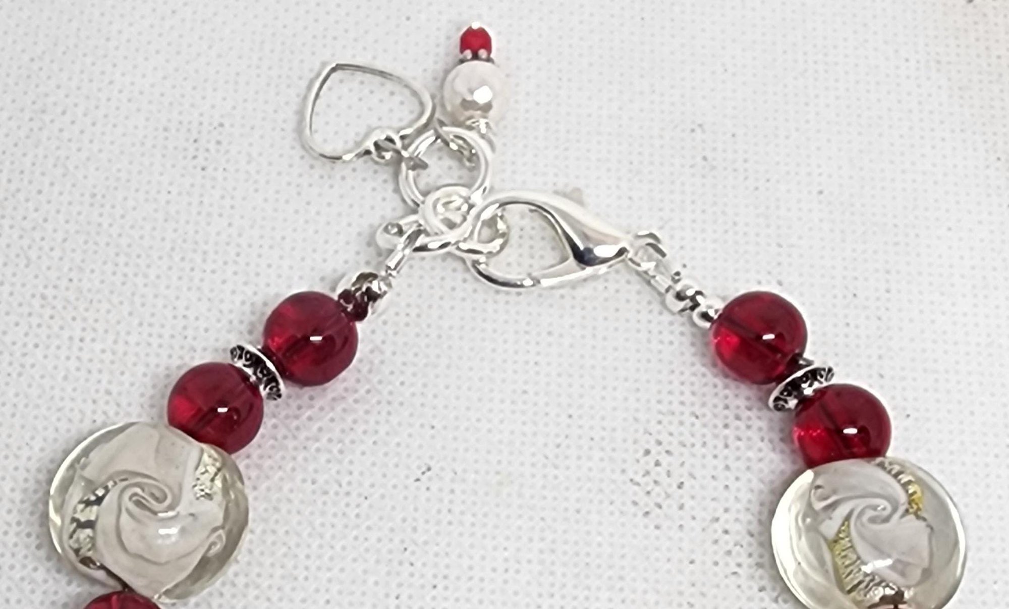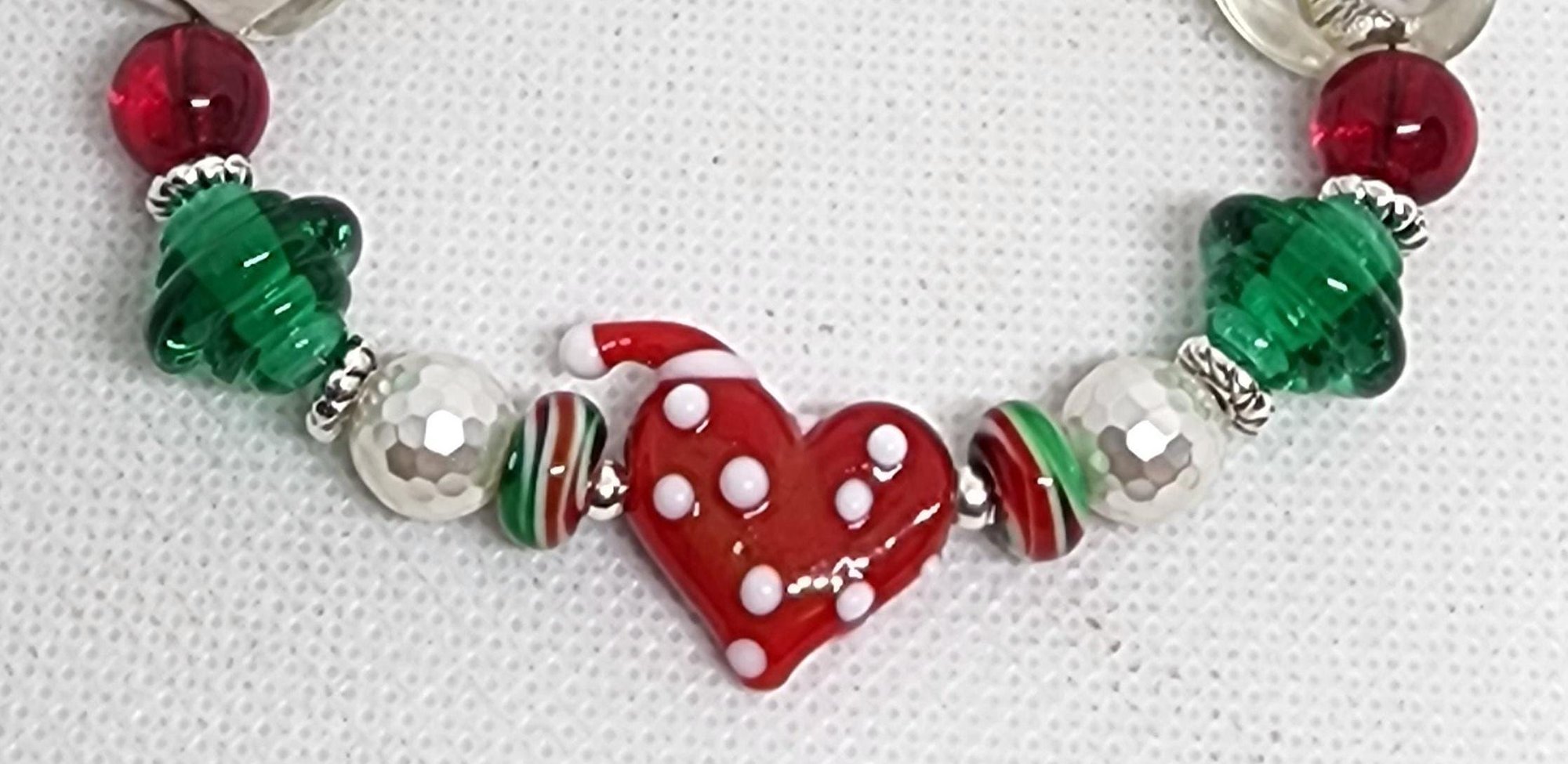 Adorable Murano glass Santa hat heart from Italy, red, white and green lampwork beads, faceted pearls and sweet charms to wrap up this little holiday bracelet. One of a kind.