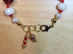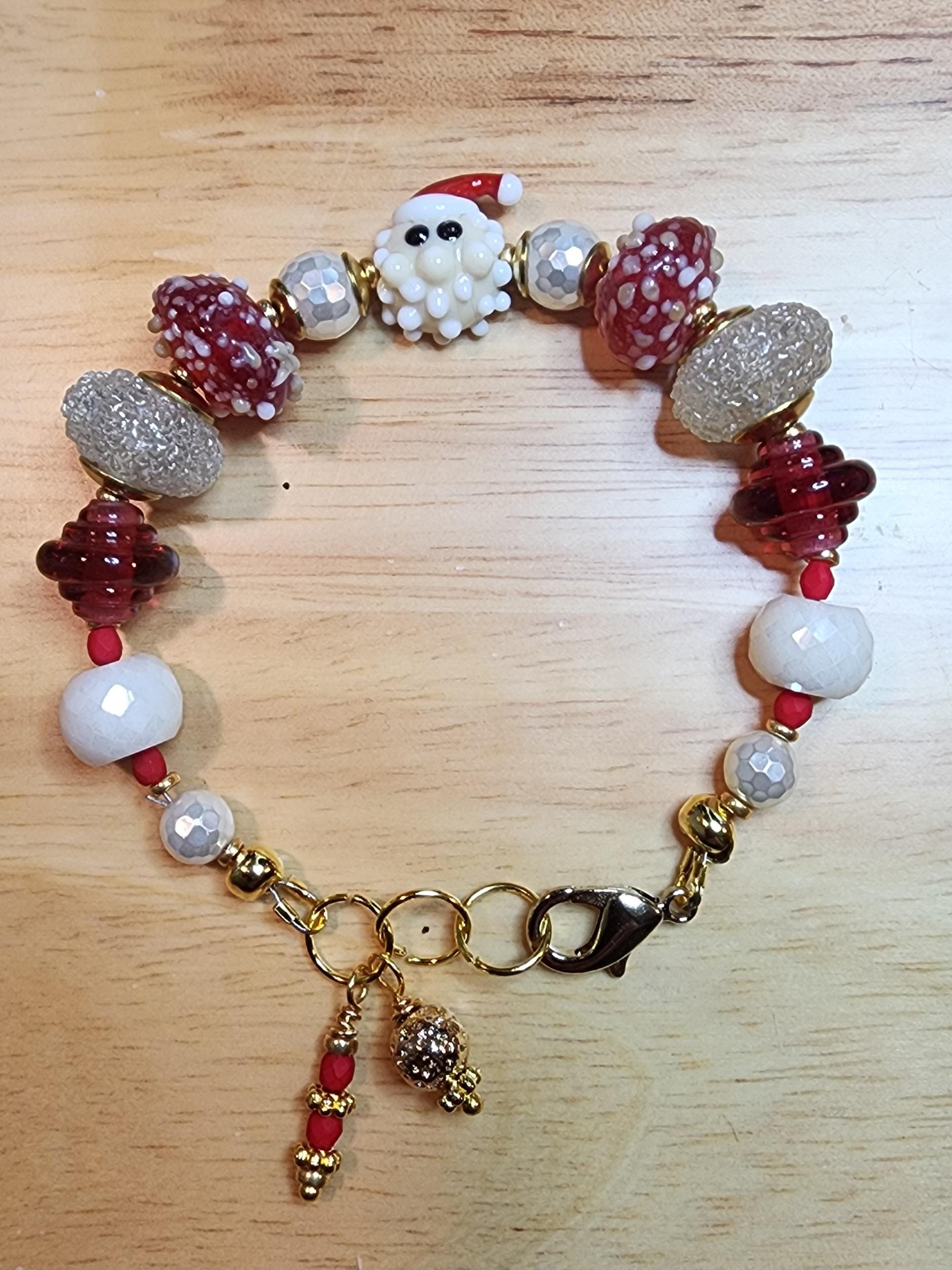 Adorable Murano glass Santa bead from Italy, red and white lampwork beads, faceted pearls and sweet charms to wrap up this little holiday bracelet. One of a kind.
