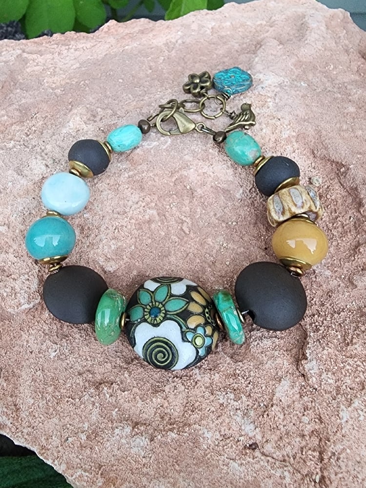 I made a bracelet using the new turquoise I purchased during my visit to the tribal reservation in Arizona. I love how the Golem ceramic beads, Jana's handmade beads, and the beautiful turquoise come together. The turquoise is placed on either side of the Golem focal bead and at the ends, bringing all these lovely elements together! 7" with extra links if you prefer it longer and can be adjusted if needed shorter.