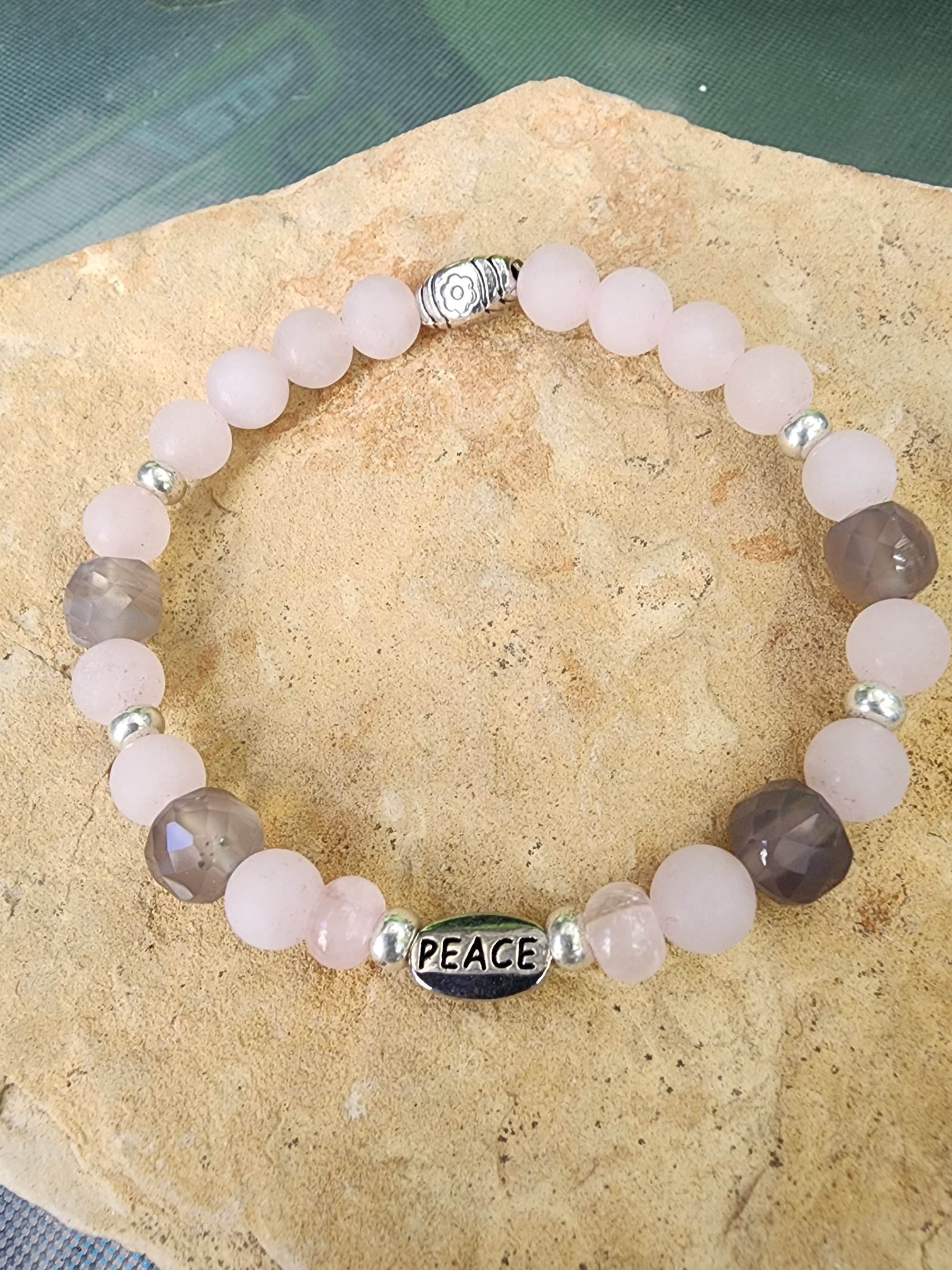 Rose quartz surrounds this peaceful little bracelet. Also available with a 'Joy' bead - share your preference when you order,