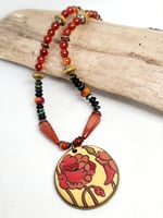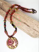 A beautiful Golem ceramic focal piece enhanced with a plethora of coordinating beads and copper findings. This necklace is approximately 16" long with a copper clasp.