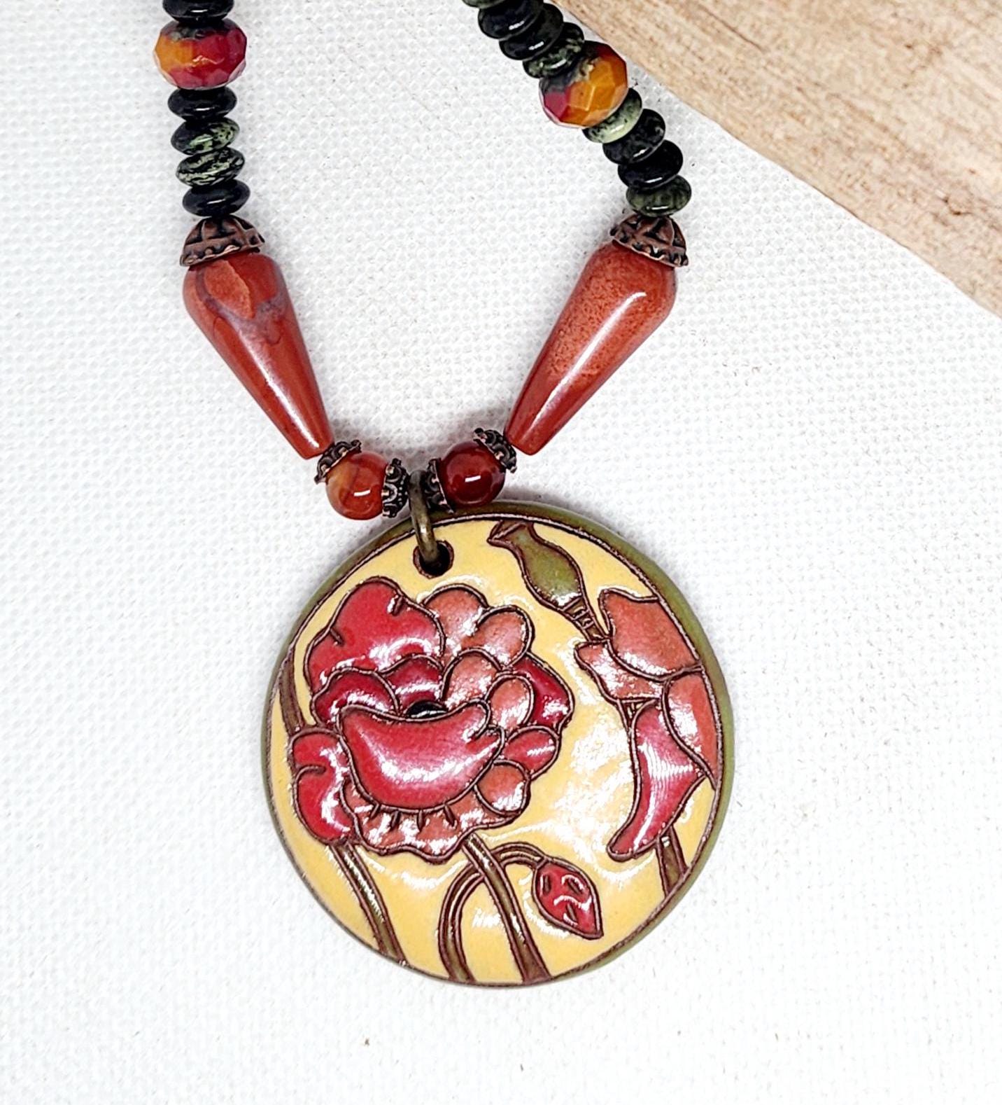 A beautiful Golem ceramic focal piece enhanced with a plethora of coordinating beads and copper findings. This necklace is approximately 16" long with a copper clasp.