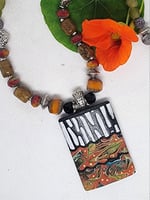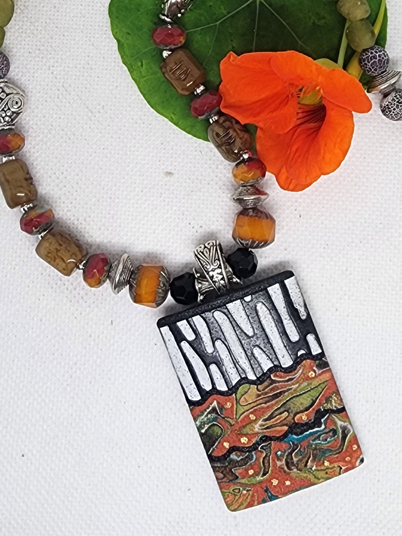 This amazing polymer clay pendant, created by Susana Paredes, is the centerpiece of the necklace, featuring a plethora of colorful beads, silver findings, and a bird clasp—one of a kind.