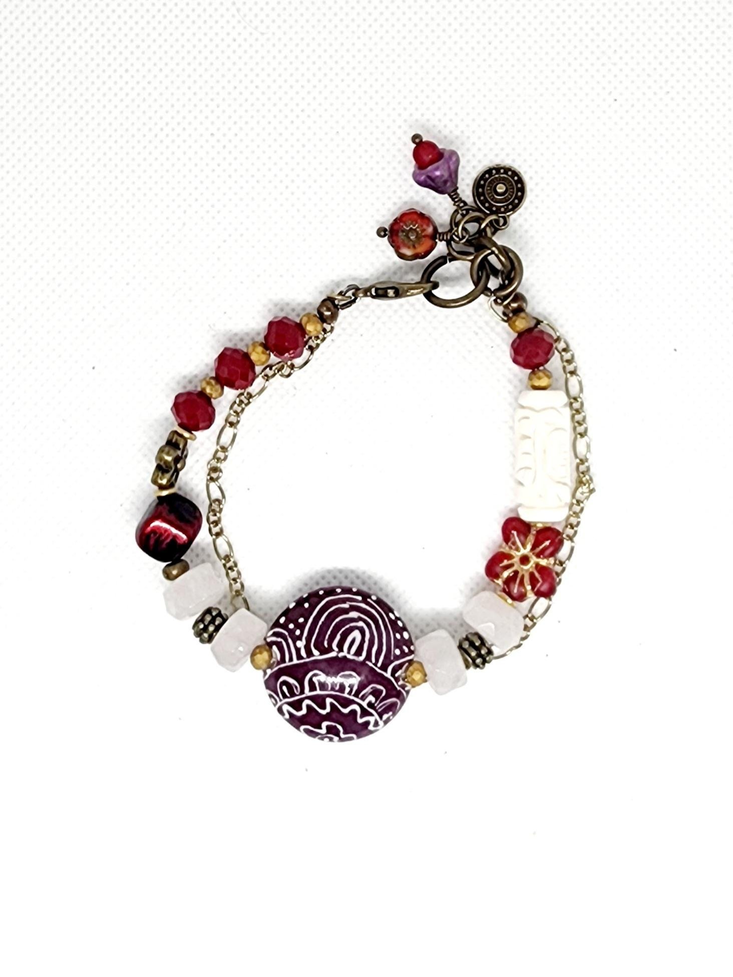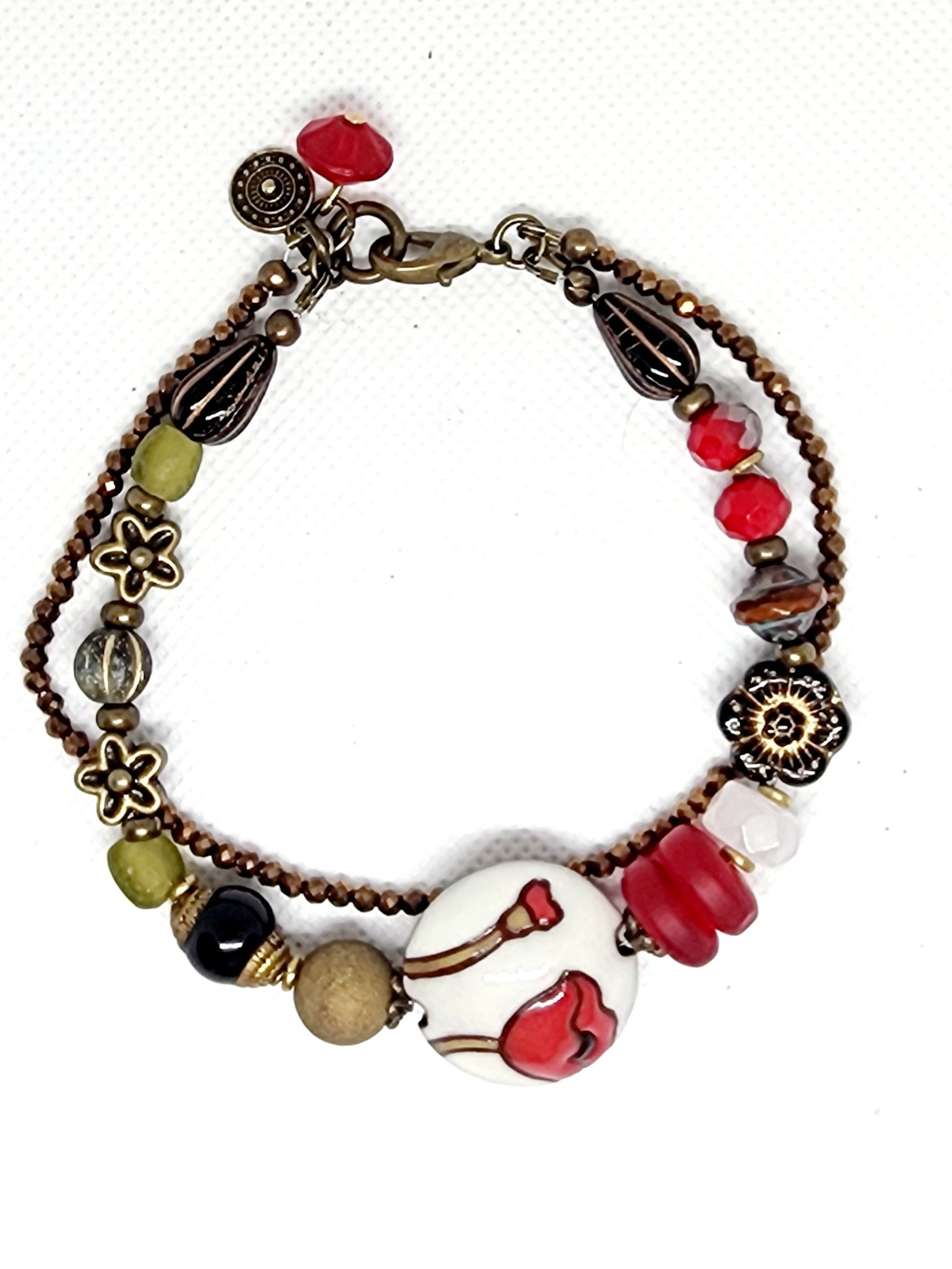Golem ceramic bead with various creative beads, brass findings, and a seed bead string of beads.