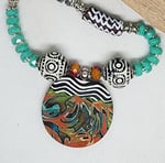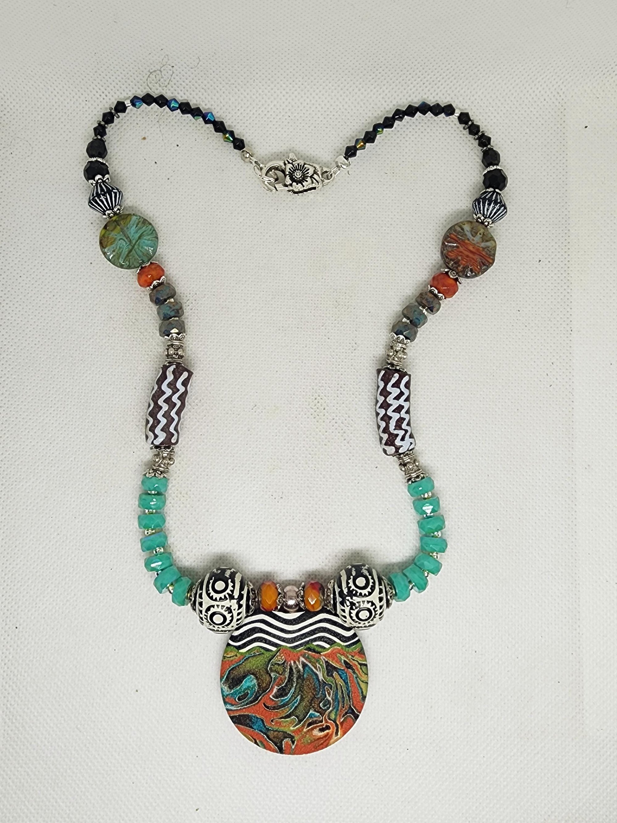 Beautiful African beads and a plethora of colorful beads dance around a beautiful polymer pendant created by Susana Paredes. One of a kind.