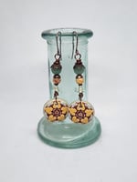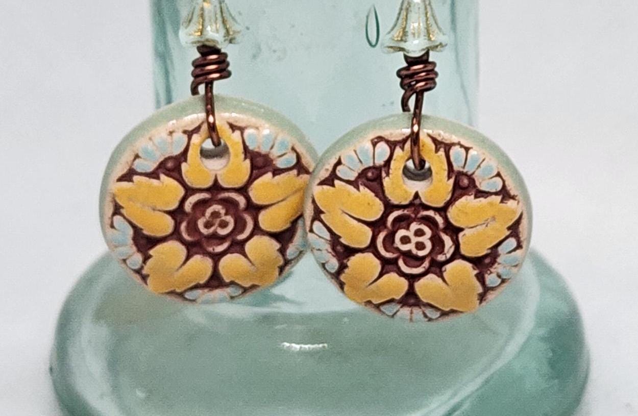 Handmade yellow ceramic focal by Damyana Dimitrova, an incredible Bulgarian artist, enhanced with coordinating beads, copper findings, and hypoallergenic ear wires. These are one of a kind.